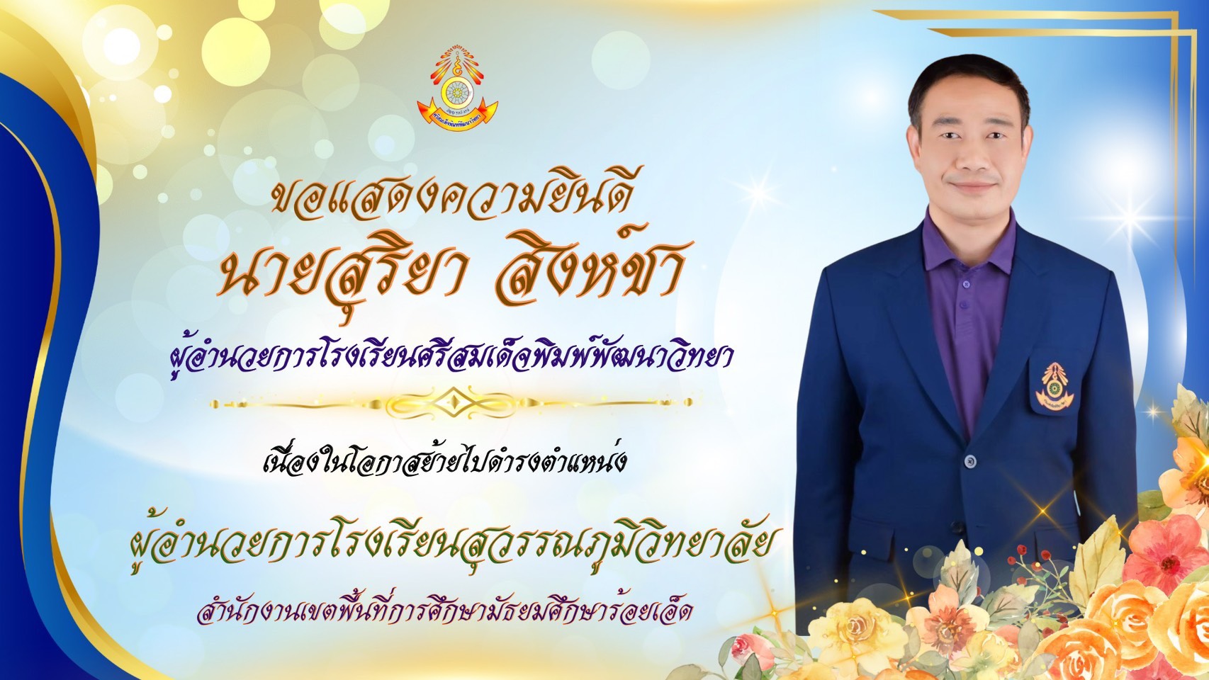 ขอแสดงความยินดี นายสุริยา สิงห์ชา ผู้อำนวยการโรงเรียนศรีสมเด็จพิมพ์พัฒนาวิทยา เนื่องในโอกาสย้ายไปดำรงตำแหน่ง ผู้อำนวยการโรงเรียนสุวรรณภูมิวิทยาลัย สำนักงานเขตพื้นที่การศึกษามัธยมศึกษาร้อยเอ็ด